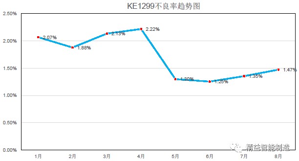 在帮A企业进行质量价值流程再造辅导后(A企业是《9步再造企业质量价值流程》一文中举的例子,它是目前国内整流子行业的龙头企业),运用这个解决问题的策略,一个月内我收到了捷报,A公司项目辅导中用作研究对象的产品不良率从2.21% 下降到了1.30%,超过了A企业期望的1.4%的目标,之后几个月都稳定在1.3%左右,如下图所示: