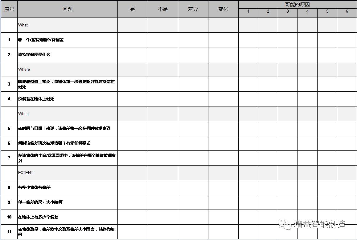 KT是KEPPNER TREGOE的简称,KEPPNER和TREGOE是兰德公司的两位社会学家,在7年的时间里面研究了上千名各行各业成功者解决问题的方法的基础上,发现他们有共同的规律,于是提炼出来了KT法。KT法从对Who / When / Where /Extent四个方面,11个问题的“是/不是”的回答来收集信息,然后再通过“差异/变化”分析法和“专家头脑风暴”排除法来识别问题的原因。KT法见下表:
