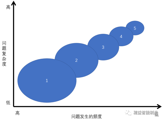 按照问题发生频度和问题本身的复杂程度,欧阳生老师将问题归结为以下5种类型,图中圆圈的大小表示该类问题数量的多少。如图一: